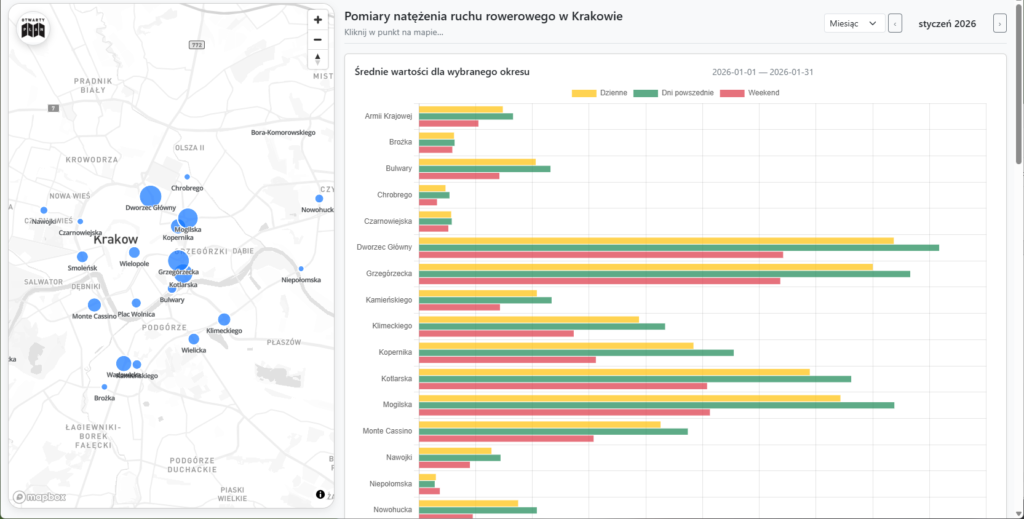 Nowa rowerowa podstrona prezentuje dane z automatycznych liczników ruchu rowerowego w Krakowie. Wizualizacja umożliwia analizę natężenia ruchu w różnych okresach oraz porównanie z typowym ruchem i wartościami z poprzednich lat.